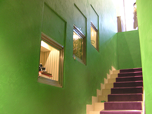 両側のヘビ皮小物ショウケースと本物のヘビをディスプレイしてしまう、なんて遊び心あるショップなのでしょうか。