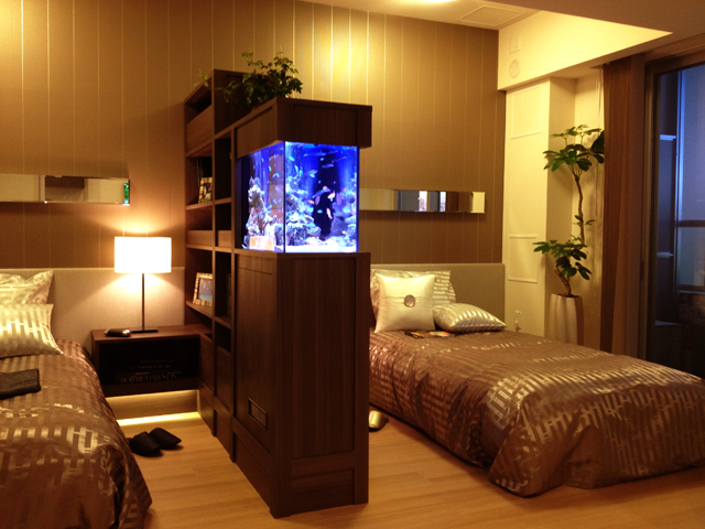 ベッドの間に置くパテーション本棚と一体にしたデザイニングアクアリウムです。