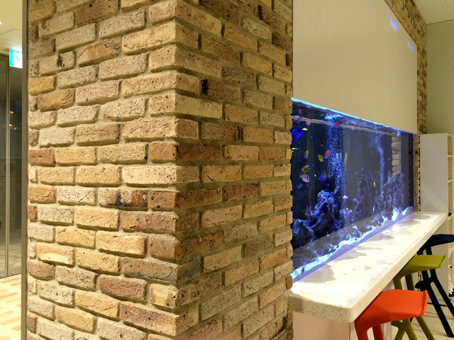 オフィスのメインエントランス前に全長3mの大型水槽をレンガ壁に埋め込みました。